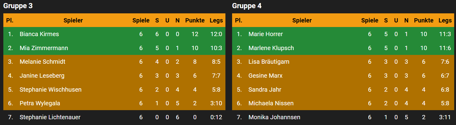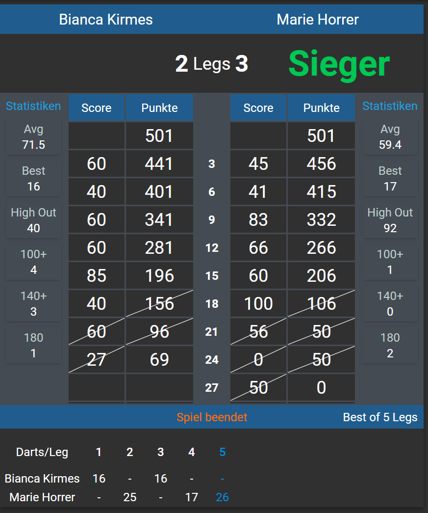 Leider sollte ihr Plan – wenn auch Genial – leider nicht aufgehen und so musste sie sich leider im Viertelfinale mit 3:1 geschlagen geben. Zumindest bei Bianca hingegen sollte das Konzept im Viertelfinale aufgehen und so konnte sie sich mit einem klaren 3:0 Sieg gegen Mandy Jeske für das Halbfinale qualifizieren! Hier ging es nun gegen Marie Horrer. Leider musste sich Bianca dann hier jedoch trotz einem 71,5er Average auch mit 2:3 geschlagen geben. Trotzdem ein toller 3. Platz und wertvolle Punkte auf dem Weg zu den German Masters! Gratulation!