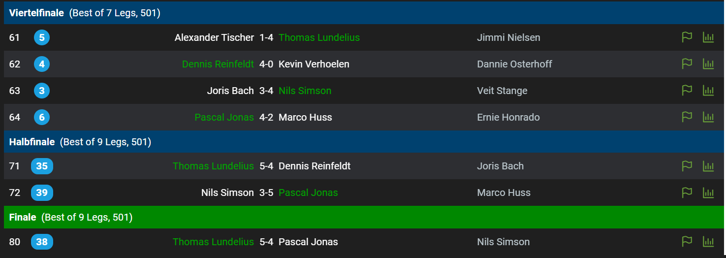 Hier sollte Tommy nun auf Jonas Nätebusch warten der zuvor den Christoph-Bezwinger Daniel Vogt aus dem Turnier nahm. Gespielt wird nun Best of 9. Das wird mal wieder lang! Nach einem verhaltenden Start mit 28 Darts für Tommy und einem besseren 17 Dart Leg sollte Tommy auch in Leg 3 17 bzw. 18 Darts auf der Hand haben doch am Ende checkte Jonas dann mit 28 Darts zum 2:1. Beide nun mal schnell, mal langsam aber im Gleichschritt und nach 24 Darts dann doch mit dem Check für Tommy zum 3:1. Nebenan Dennis Reinfeldt und Malte Skarupke. Sollte Dennis hier der Sieg gelingen könnte es zur Wiederholdung der Halbfinalpartie des gestrigen Abends kommen. Hier gewann Tommy knapp mit 5:4. Spannung wäre vorprogrammiert. Inzwischen Tommy zum 4:1 mit 19 Darts. Das Ende scheint nahe doch Jonas gibt nochmal Gas und steht nach 15 Darts bei 24 während Tommy noch 218 Punkte auf der Uhr hat. 4:2 in 17 Darts. Es geht weiter spannend zu während Dennis mit 4:0 in Front liegt und die Wiederholung somit in greifbarer Nähe liegt. Tommy mit 21 zum 5:2 und Dennis mit 5:0. Das Finale der Herren steht somit fest! Beste Chancen für Tommy den Doppelsieg des Wochenendes daheim für sich zu sichern. So oder so dürfte dieses Wochenende quasi die Qualifikation für ihn und die German Masters bedeuten, so er denn dabei sein möchte wird es schwer für alle anderen werden ihn selbst bei mäßigen weiteren Turnieren von den Qualiplätzen zu verdrängen.
