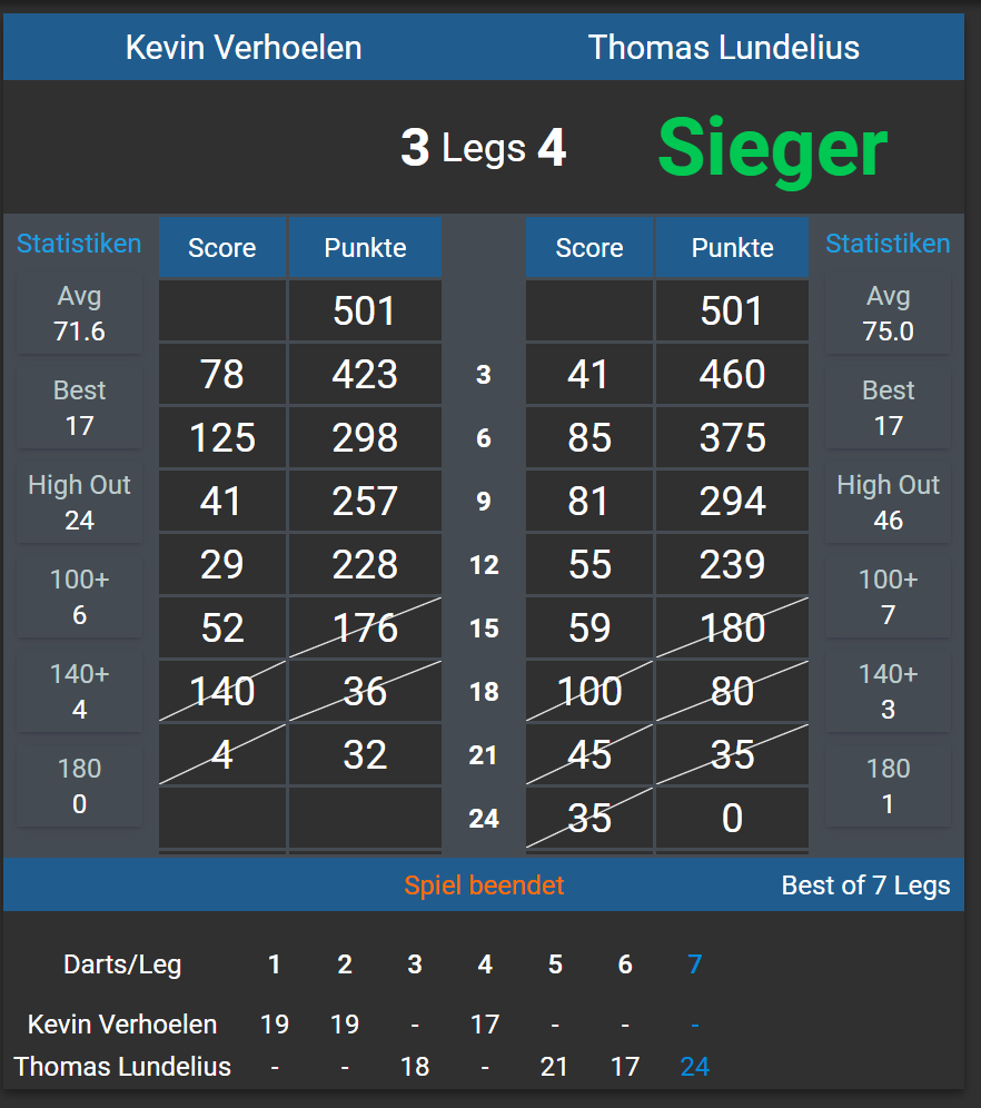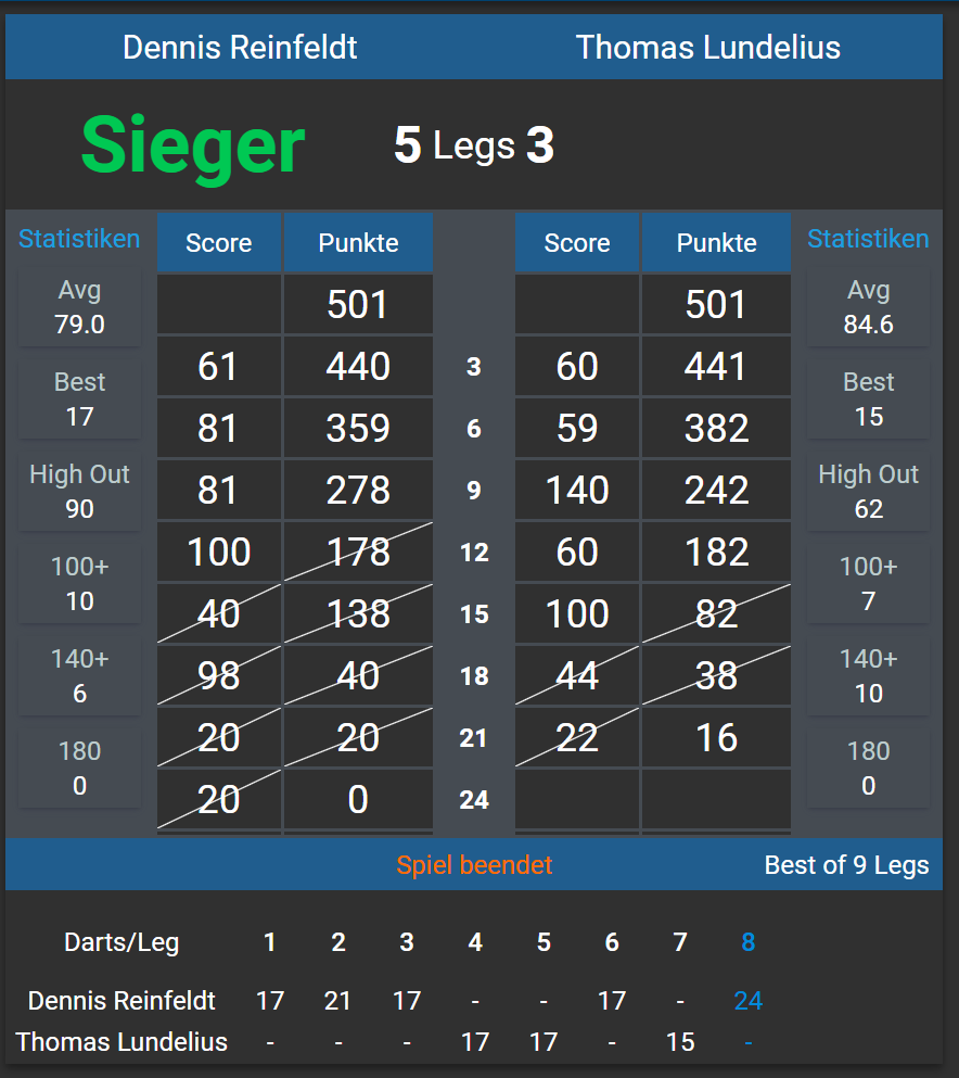 Nun gings los. Starker Start von Dennis mit 17/21/17 Darts wobei auch Tommy Checkdarts liegen lies und beide deutlich über 80 im Average liegen. Tommy zum 1:3 Anschluss mit 17 Darts und zum 2:3 mit 17 Darts. Die 17 Darts scheinen beide zu mögen. Doch nun wieder Reine mit 140 ab ins 6te Leg und Tommy ledliglich mit 41 hinterher. Die Partie verspricht ähnliche Spannung wie das Halbfinale am Samstag. Dennis nach 15 Darts auf 36 und Tommy auf 20. Doch Dennis hat Anwurf und so werden es erneut die 17 Darts zum 2:4. Ein Leg für Dennis während Tommy nun 3 Legs an stück benötigt um das Spiel noch für sich zu entscheiden. Tommy mit 140 gefolgt von 140 und 60 um nach 9 Darts auf 161 und somit auf Check zu stehen. Dennis bei 218 Rest. 99 für 62 Rest für Tommy. Dennis bleibt dran und steht auf 118. Tommy muss checken und tut es mit 15 Darts zum 4:3. Aufschlag Dennis. Mit 61 geht´s ins Leg. Tommy mit 60 hinterher. 81 von Dennis, 59 von Tommy. Das wird Eng. Erneut 81 von von Dennis doch Tommy dreht nun auf und macht die 140 für 242 Rest. 100 von Dennis für 178. Tommy „nur“ 60 nach 12 Darts nun bei 182. Er braucht den Fehler von Dennis. Dennis nur 40 für 138. Tommy geht mit 100 auf 82 Rest. Ein realistischer Check. Doch Dennis stellt auf 40. Tommy muss erneut und dieses mal kann er nur auf 38 stellen. Doch auch Dennis verpasst und ist nach 21 Darts nun bei 20 Rest. Tommy leider ebenfalls 3 Darts ohne check verleibt bei 16 Rest. Hier war die Chance zum 4:4 doch Dennis checkt nun zum Sieg in 24 Darts. Trotzdem wieder ein klasse Turnier Tommy und sehr geile 2 Turniertage! Super Fantastisch und Gratulation!